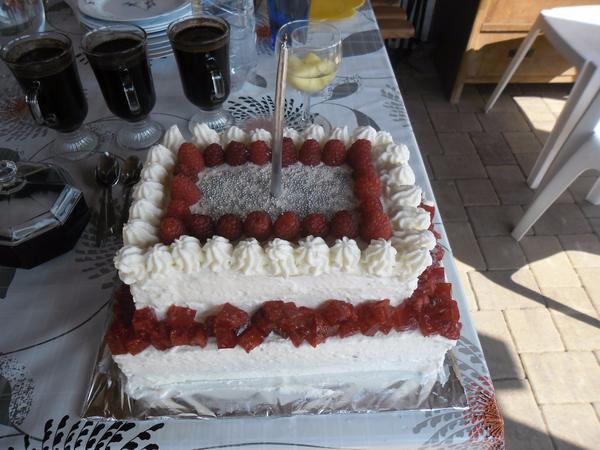 @akika722 No táto bola výborná aj chuťovo, korpus bol mramorový, vo vnútri bola kyslá smotana s vanil. cukrom a želatínou a na tom (lepšie povedané v tom, lebo smotana bola aj na tom) bolo malinové želé, to je to, čo je na obrázku nakrájané na kocky po obvode spodného poschodia. Inšpirovala som sa z internetu, tam sa to tuším volalo malinová rozprávková torta, ale nie je to presne to, čo som robila ja. Túto mi veľmi chválili.