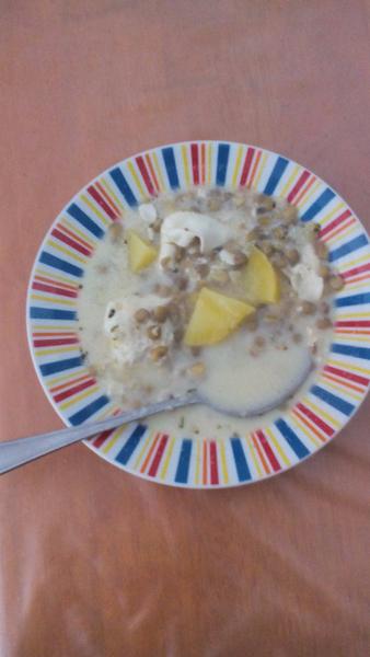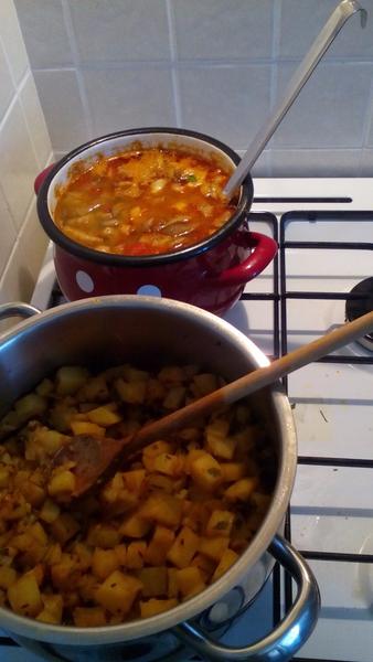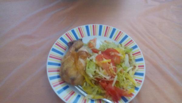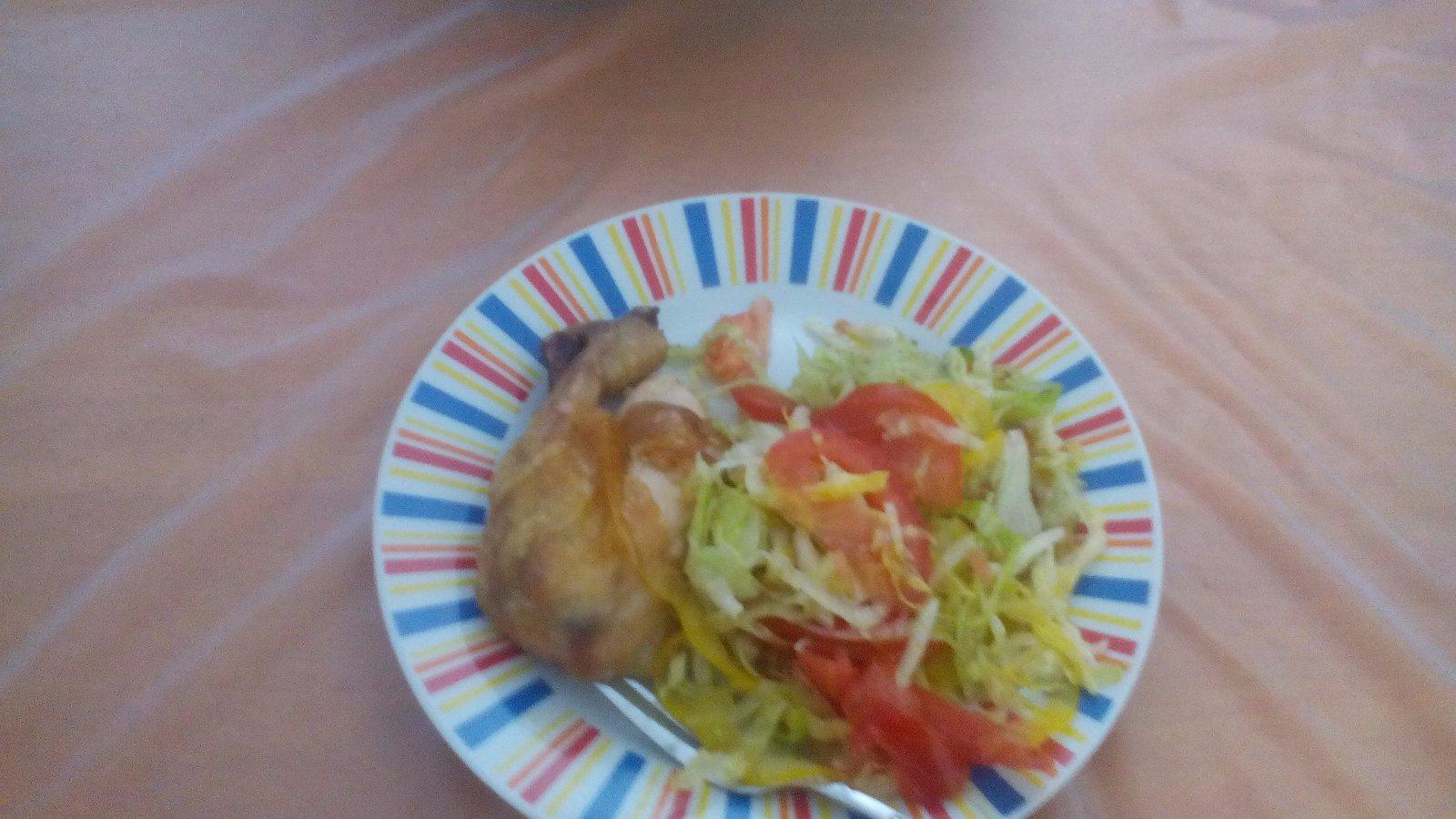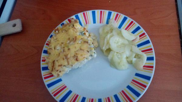my dojedáme polievku zo včera zeleninová s krupicovými haluškami, pečené kuracie štvrte, pyré, uhorkový šalát 🙂