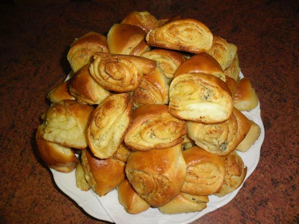 Vykynuté těsto si taky rozdělíme na 4 stejné části. Každou část vyválíme, potřeme čtvrtinou máslové náplně a posypeme čtvrtinou Nivy. Spojovací stranu potřeme rozšlehaným vejcem a svineme do rolády. Rozkrájíme na trojúhelníky, naskládáme na plech s pečícím papírem a potřeme rozšlehaným vejcem. Necháme aspoň 30 minut ještě kynout v teple.