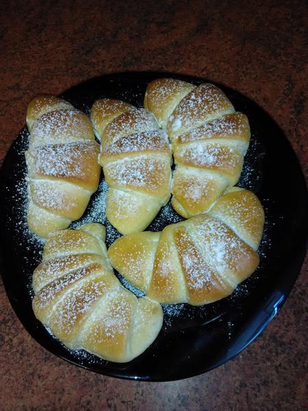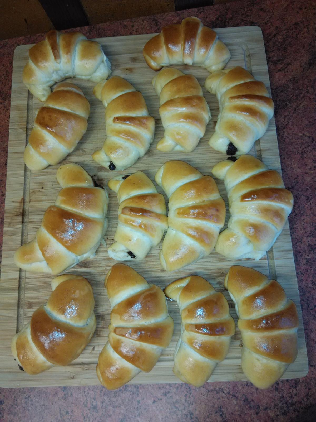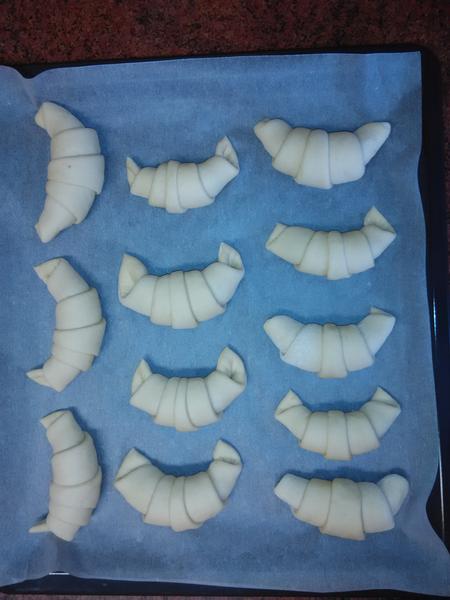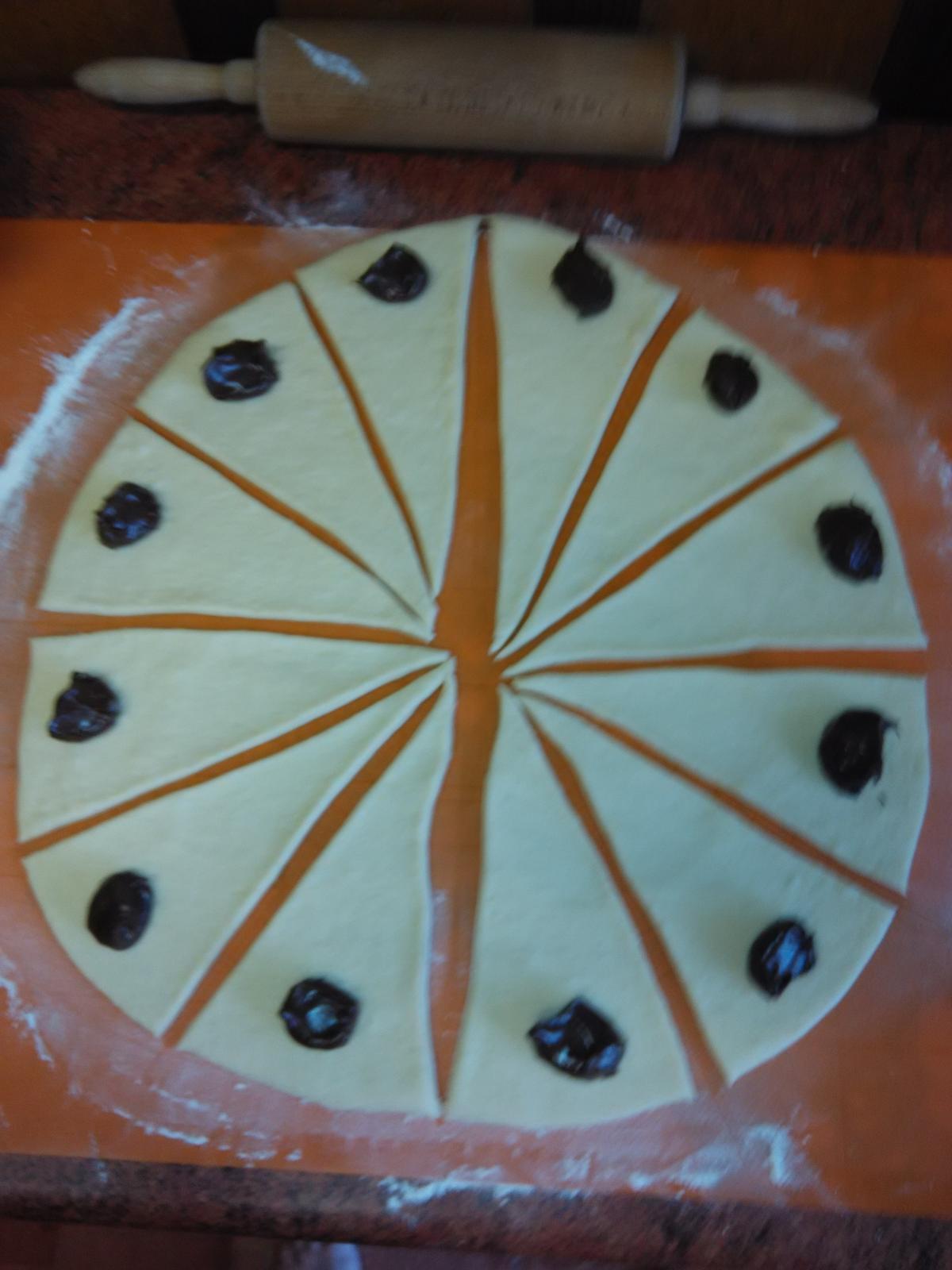 Polovinu těsta vyválíme do kruhu, půl cm tloušťka, a rozkrájíme radýlkem na osminy. Každý trojúhelník plníme rovnou lžičkou nutely a stočíme od širšího okraje do požadovaného tvaru. Při stáčení druhou rukou vytáhujeme ten druhý okraj. Dáváme na plech s pečícím papírem a trochu stočíme. Necháme asi 15 min pod utěrkou kynout.
