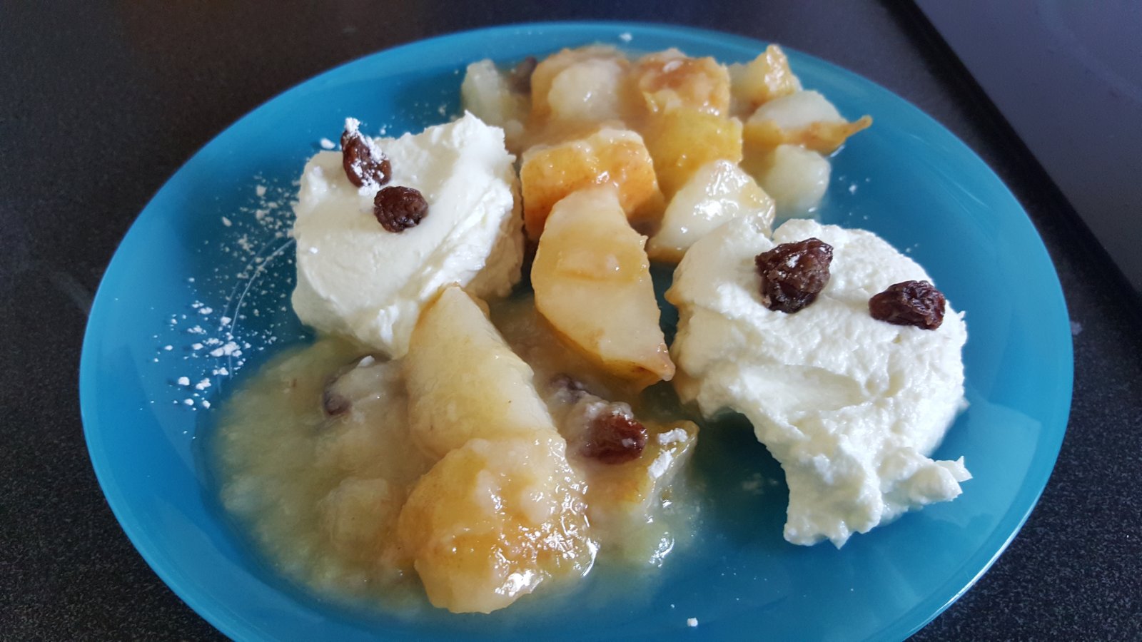 Chcela som robiť palacinky ale nechce sa mi stat pri nich takze improvizácia :::v chladnicke mala nacaty tvaroh a mäkke hrušky. Tak som ich hodila na maslo, vanilka trosku rumovo-ceresnoveho likeru a mnamka sa mi zdarila 😀