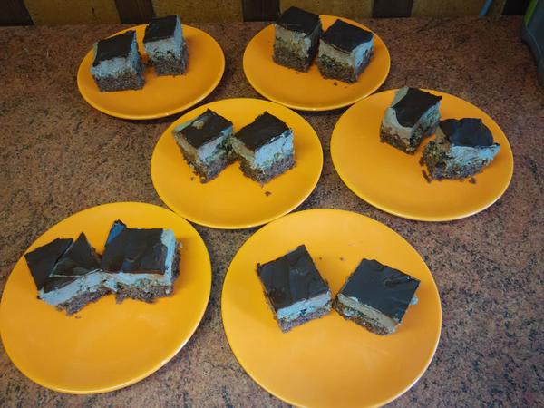 V hrnci nad parou si rozpustíme čokoládu na vaření s máslem. Necháme ji chvilku zchladnout a pak ji rozetřeme na ztuhnuté řezy. Dáme nejlépe přes noc ztuhnout do lednice.