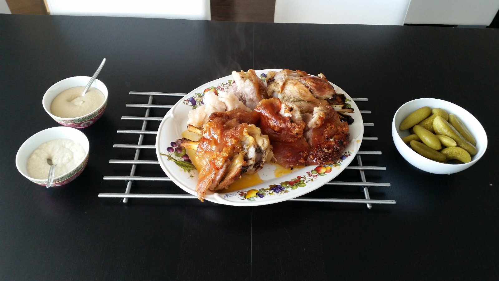 Pórová polievka, guláš pečený v rúre s knedľou a Trio rezy.
