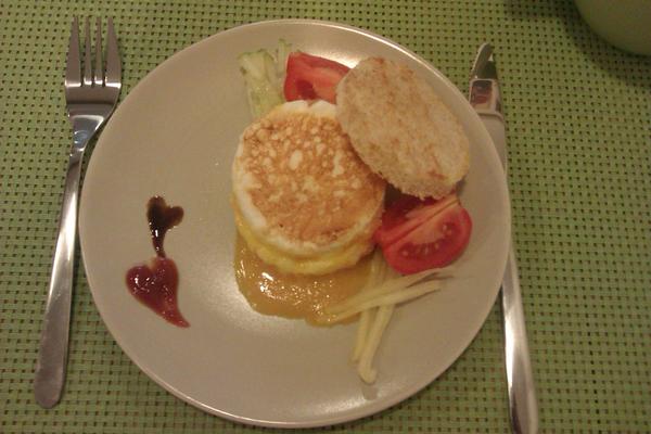 tekvicová polievka, palacinky s domácim hruškovým a slivkovým lekvárom