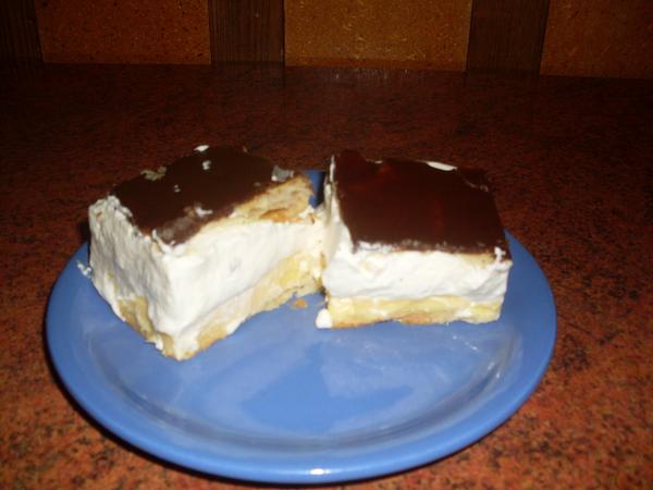 Na druhý plát upečeného těsta rozetřeme čokoládovou polevu, kterou jsme si připravili nad parou. Při roztírání si můžeme pomoct silikónovým štětcem. Necháme trošku vychladnout a rozkrájíme na čtverce a pak necháme polevu ztuhnout úplně.