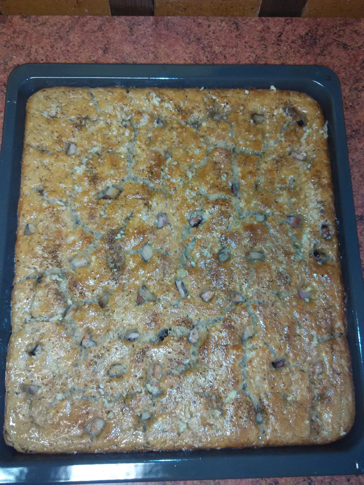 Nožem těsto propícháme, poklademe slaninkou nakrájenou na kostičky, posypeme mořskou solí a drceným kmínem a dáme péct do vyhřáté trouby :