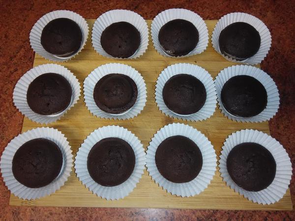 Muffiny dáme do trouby o jedno patro níž, než doprostřed a pečeme 18-19 minut na 190 stupňů. Zkontrolujeme je ale už po 15 minutách. Nesmí se péct déle, než je nutné, jinak budou suché. Hotové jsou, když zkusíte špejlový trik a když na povrchu po zmáčknutí lehce pruží.