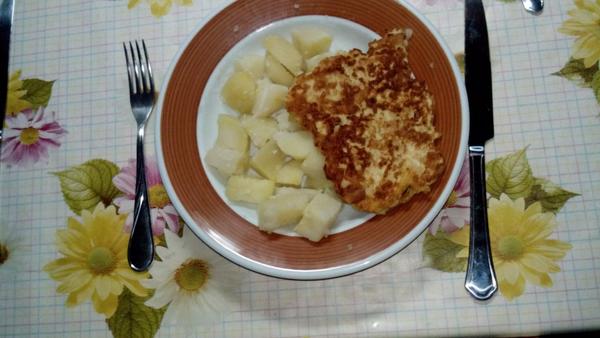 Kuracie prsia zapekane v syre a varene zemiaky,polievka mrvenicova zo vcera