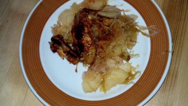 pečený zajac na cibule so slaninkou zaliaty smotanou, zemiaková kaša, polievka zo zajaca, a stratené kura...