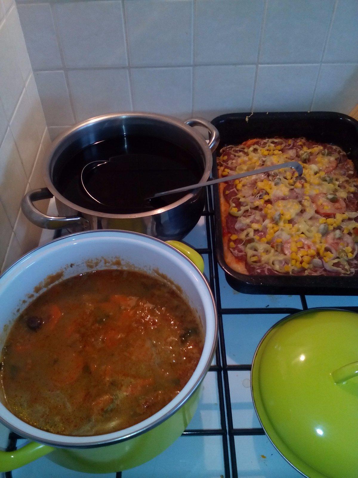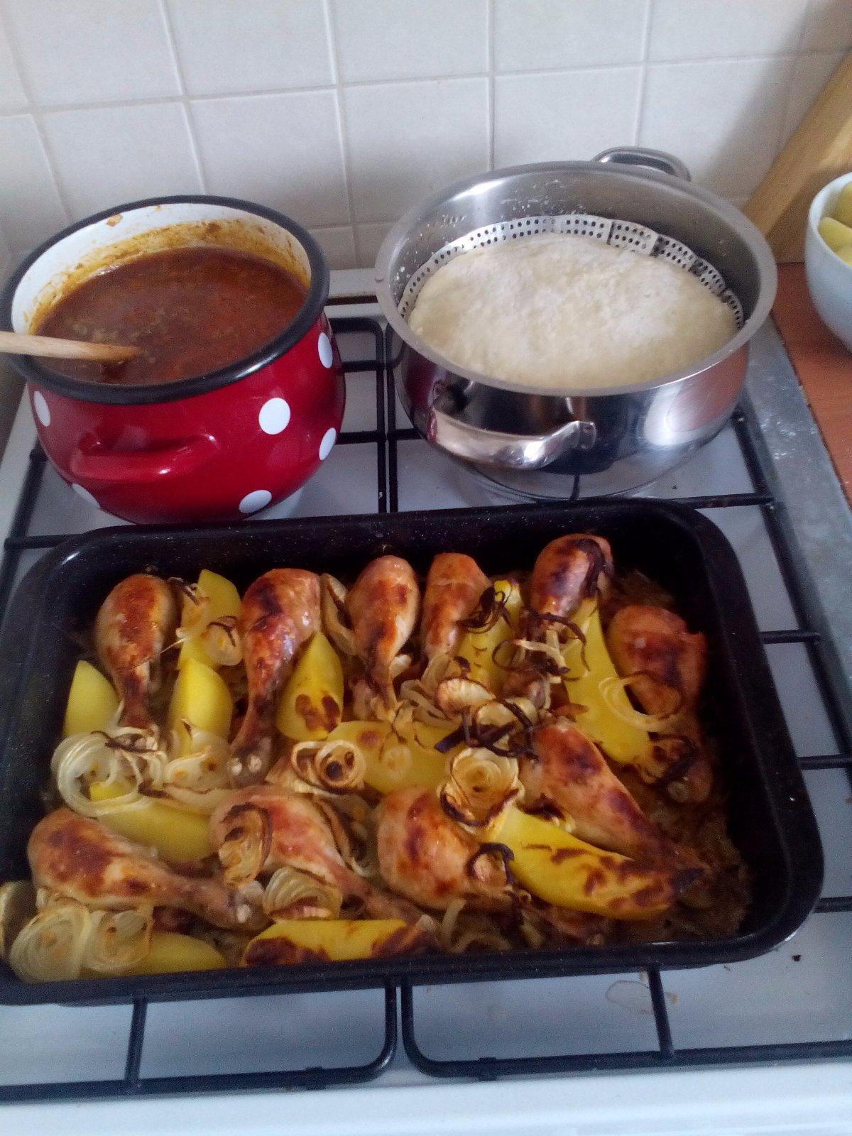 Plnené pečene kuracie stehná s ryžou, o dva dni cestovina zo syrovou omáčkou a brokolicou, potom kelovo zemiaková kaša a fašírku pečená v rúre a špenát zo zemiakovou kašou a vajcom. Polievka fazuľová a potom zeleninová. Toto budem variť v priebehu týždňa 🙂