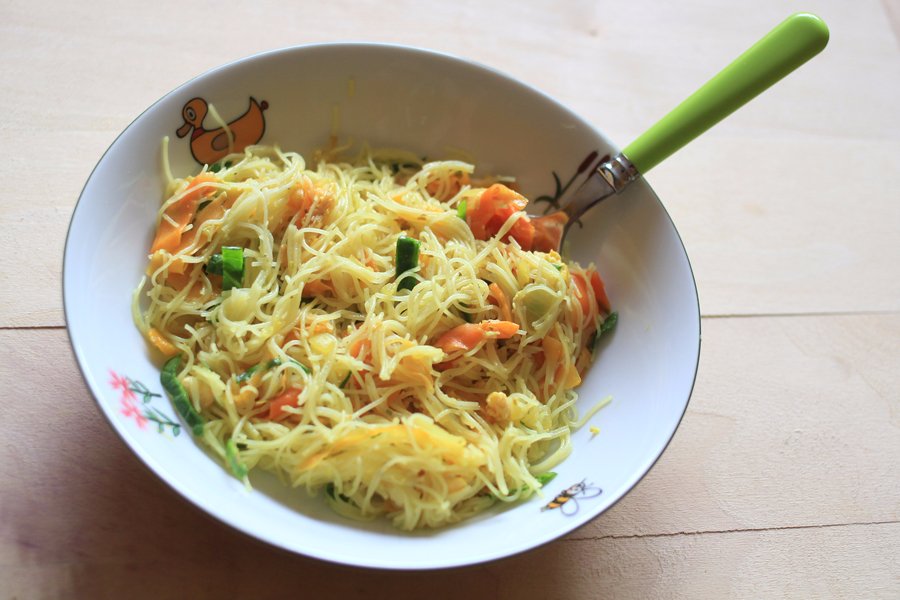 Vsetko nadrobno nakrajat, ja som vajicka, mrkvu a redkovky nastruhala, premiesat, pridat stipku soli, salatove korenie a zmiesala som lyzicku tatarky s asi 4 lyzicami vody na zalievku. 🙂