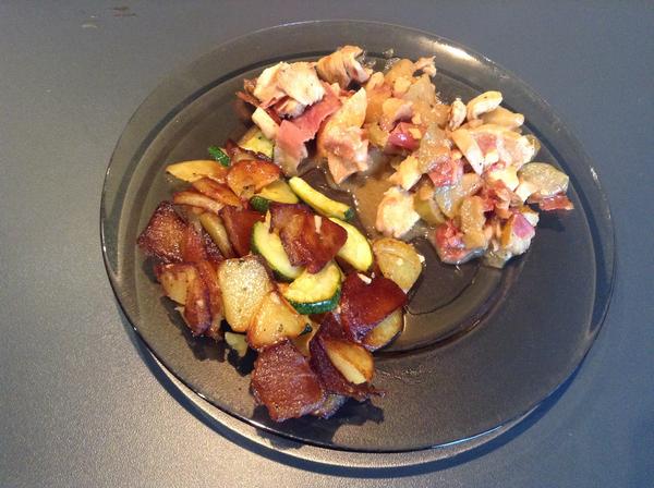 Kedze sme vcera zvolili tu pohodovu nedelu a boli sme sa najest v restike tak dnes som musela varit. A navarila som špíz a opekane zemiaky.. A do špízu som davala kuracie masko, sampiony, slaninku a k tomu este cesnakovy dresing 🙂