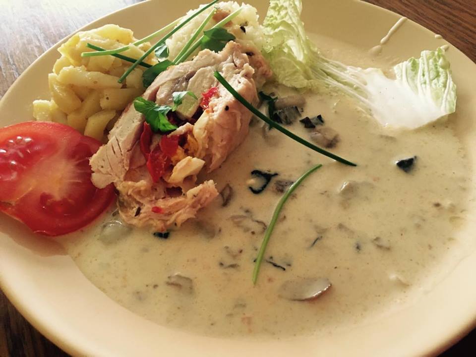 sosovicova polievka, kuracie so sampinonovou smotanovou omackou, cestoviny