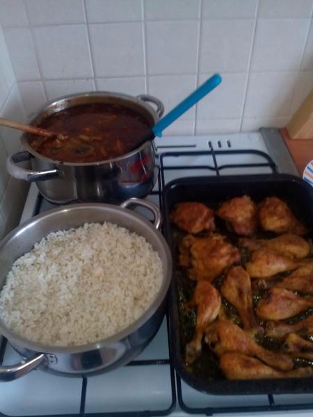 muz varil nejaku lecovo-klobasovu zmes a k tomu ryzu a ja som spravila broskynovo smotanovu tortu, na vecer sa mi pecie chlebik