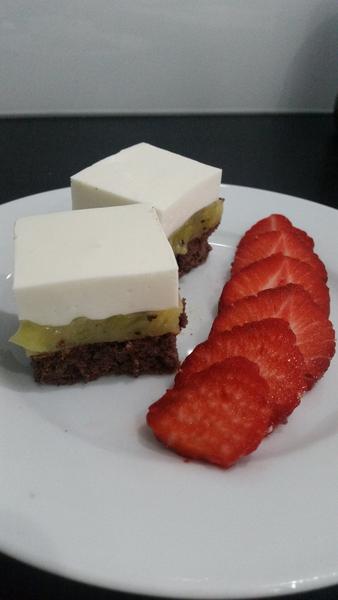 Na vychladnutý kakaový korpus vylejeme kiwi plnku, ktorú si pripravíme takto : Zrelé kiwi očistíme a nakrájame na menšie kúsky. Vložíme do hrnca zalejeme 100 ml vody a prevaríme 2-3 minútky, pridáme cukor a vanilkový cukor. Premiešame. V 200 ml studenej vody rozmiešame 1 vanilkový pudingový prášok a vlejeme ku kiwi základu. Celé premiešame a privedieme k varu. Hotové ešte hotové ešte horúce vylejeme na vychladnutý kakaový korpus.