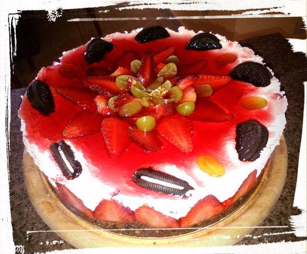 @domi237 ahoj no bol to taky vymysel je to nepecena tortaSpodok je z Oreo keksov potrvenych a vymiesanych s roztopenym maslom a cokoladou horkou to utlacis na,spodok formy a das dookola platky jahod rastlinnu slahacku vymiesas pridas polku mascarpone praskovy pras.cukor citronovu kvoru a kyslu smotanu stuzovaca trochu ak treba a vymiesas natres cast na korpus posypes oreo naukladas platky kivi a bananu na to som dala dvoch coko brumikov pomrvenych a zase slahacka uz setka na vrchu su jahody hrozno oreo a zelatinou zaliate...celu noc to bolo v chladnicke