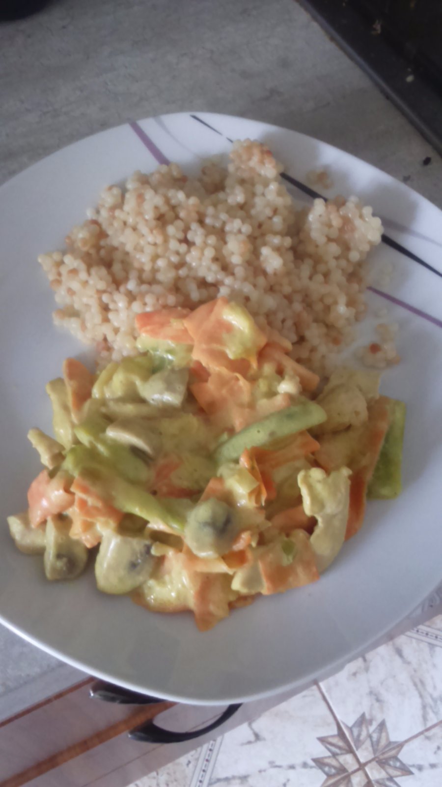 My dnes toto, totalna improvizacia, na masle oprazene kuracie kusky, osolene, okorenene, potom som ich vybrala, do vypeku dala cibulku, papriku, cuketu, sampiony, mrkvu, oprazila som, okorenila, osolila, pridala grilovacie korenie na zeleninu a kurkumu, ked to bolo makke, pridala som maso, smotanu na slahanie a nechala vyredukovat, nakoniec dochutila citronovou stavou a hotovo, urobila som tarhonu k tomu