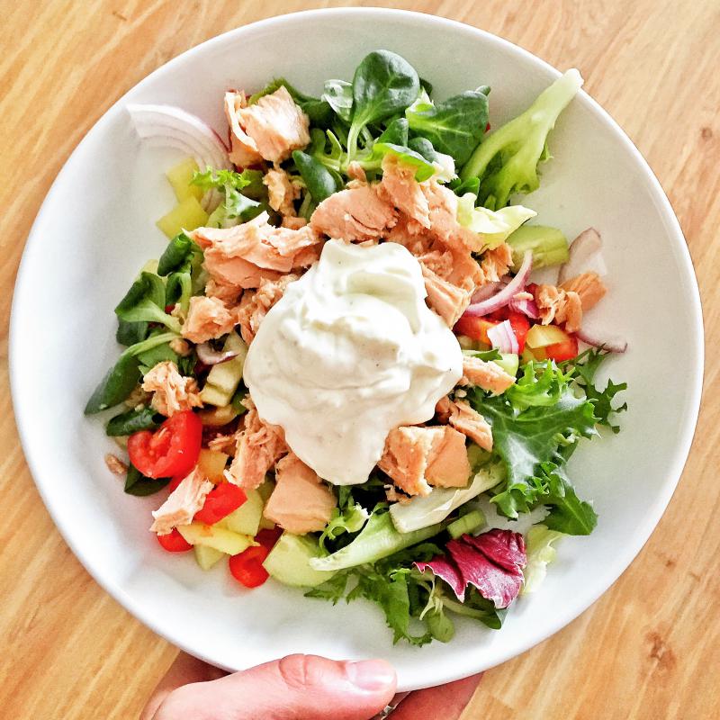 Dnes je škaredé upršané počasie tak som sa rozveselila farebným šalátom s tuniakom a jogurtovým dresingom 😀 😀