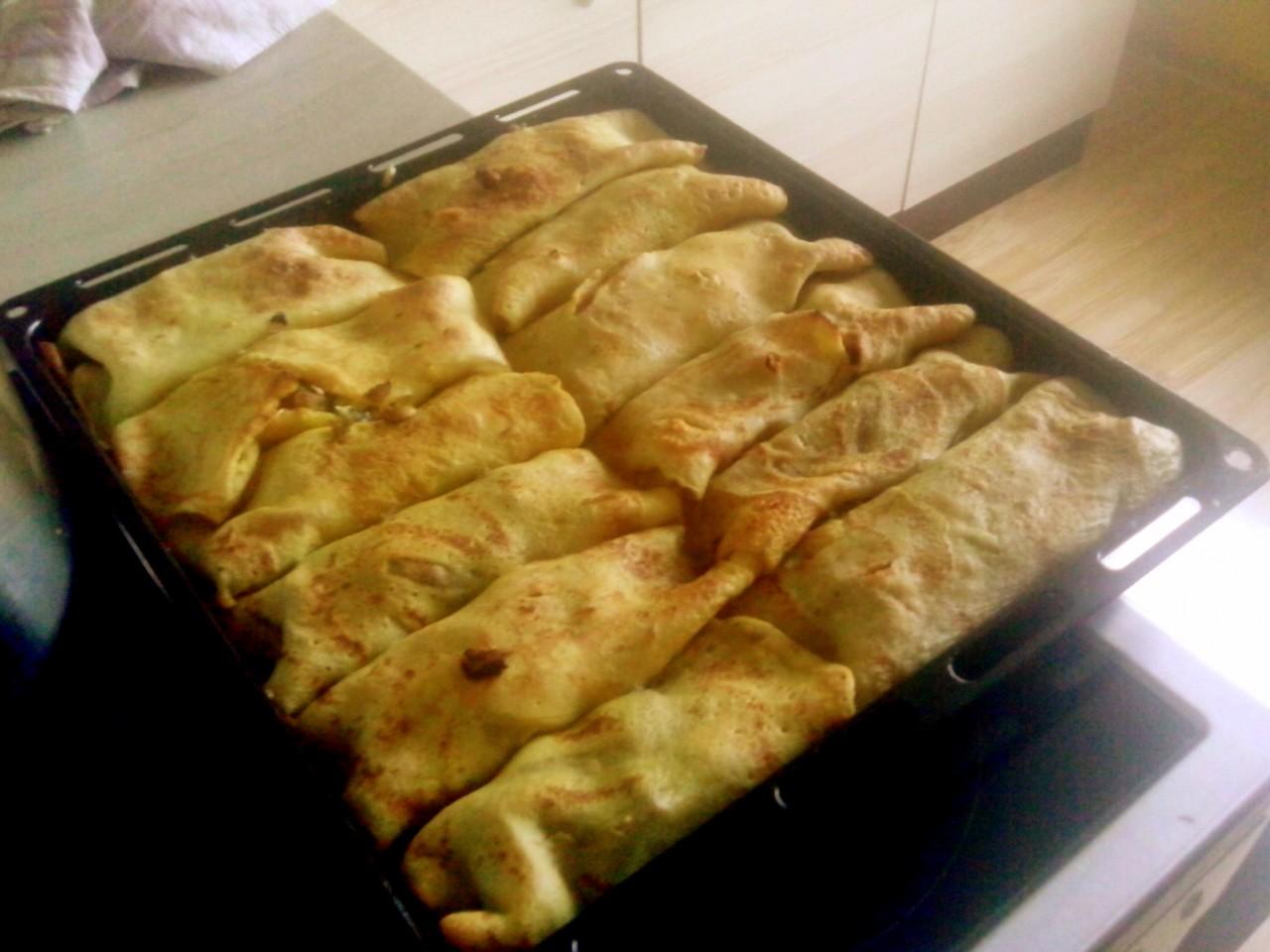 @lujzamisko ahoj🙂 robila som to vcera 1x aa vybornee:* palacinky klasika len bez cukru som si narobila (sol,vajicka,muka,mlieko,korenie), na dalsej panvicina kocky nakrsjane a dochutene kuracie maso oprazila, a ptm v dalsej panvivi cibulku ptidala som cerstvr sampinony,spenat,cesnak a zadadochutila🙂 ptm som plnila palacinku dala somtam maso, na to zmes sampinony spenat a nadtruhany syr zsbalila polozila na plech a dala na cca 15 min do truby aby boli troskutie palacinky chrumkave🙂