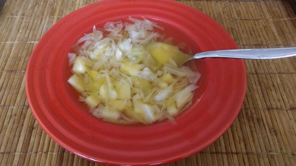 kapustová polievka, ryža a zapekané kuracie prsia s broskyňou a syrom