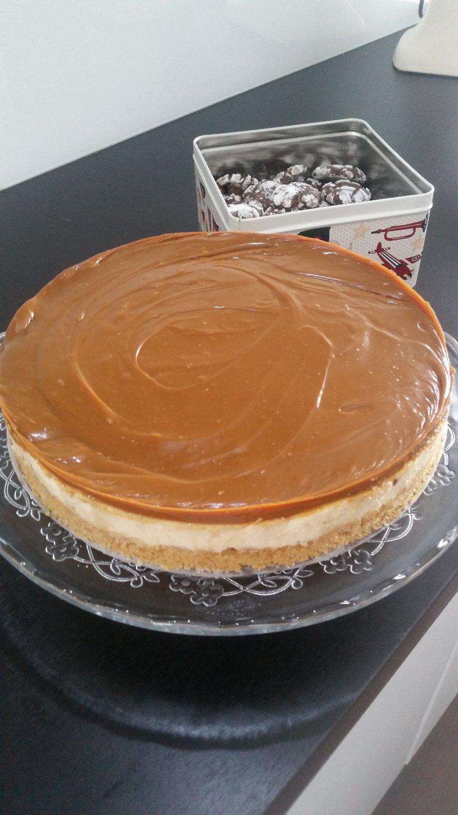Kolac nechame vychladnut. Karamel si zmiesame so solou a natrieme na vychladeny kolac.