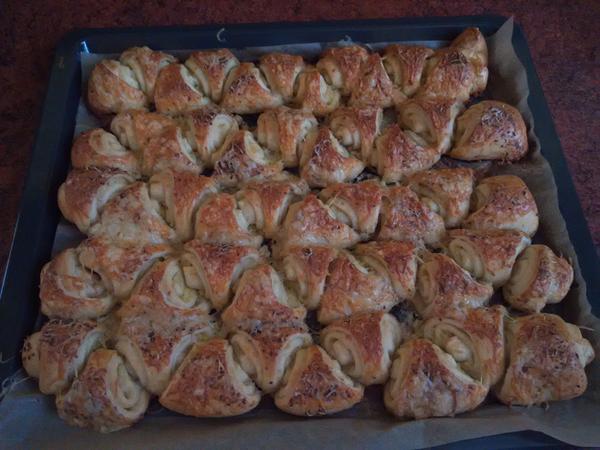 Pak těsto rozdělíme na 5 částí, rozválíme, potřeme náplní a zavineme jako závin. Dáme na plech s pečící podložkou nebo papírem. Potřeme důkladně žloutkem, posypeme kmínem nebo sýrem /podle chuti/.