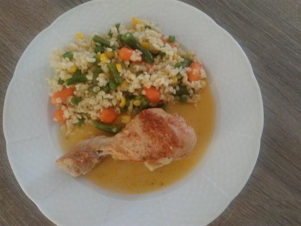 krúpové rizoto so zeleninou, grilované kura so zemiakmi a šošovicová polievka