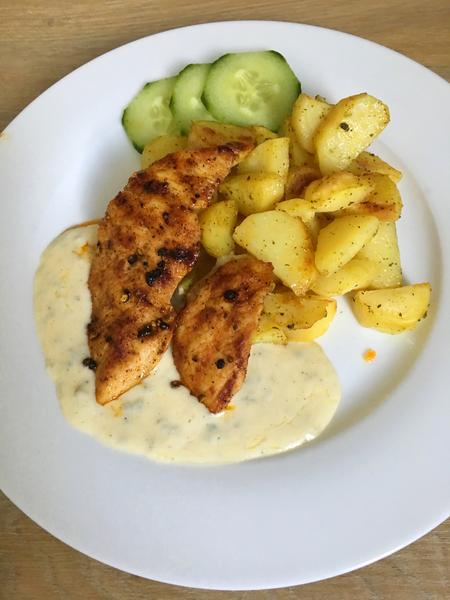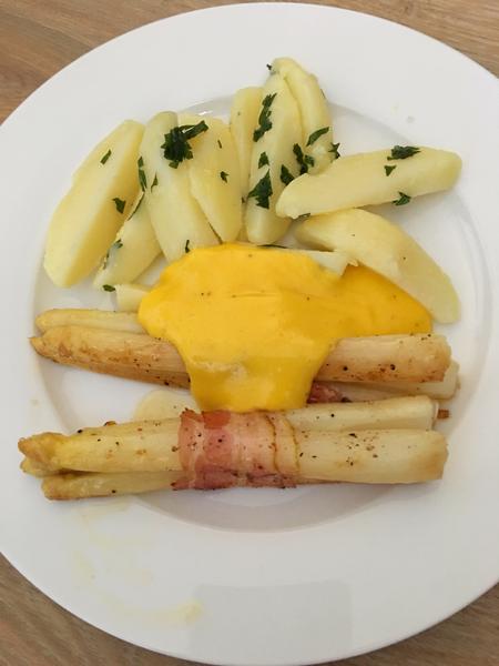 Zeleninova polievka s rezancami. Zemiaky, morcacie prsia na prirodno a brokolica s holandskou omackou...