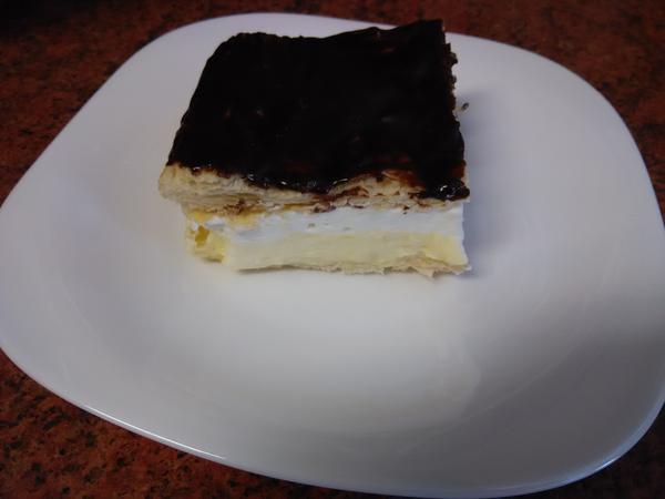 Lístkové těsto rozdělíme na poloviny, každou polovinu vyválíme na velikost plechu a o kousek více, protože se při pečení trošku zcvrkne. Obě poloviny upečeme do zlatova (samozřejmě každou zvlášť). Necháme vychladnout a jedno těsto nakrájíme na čtverečky.