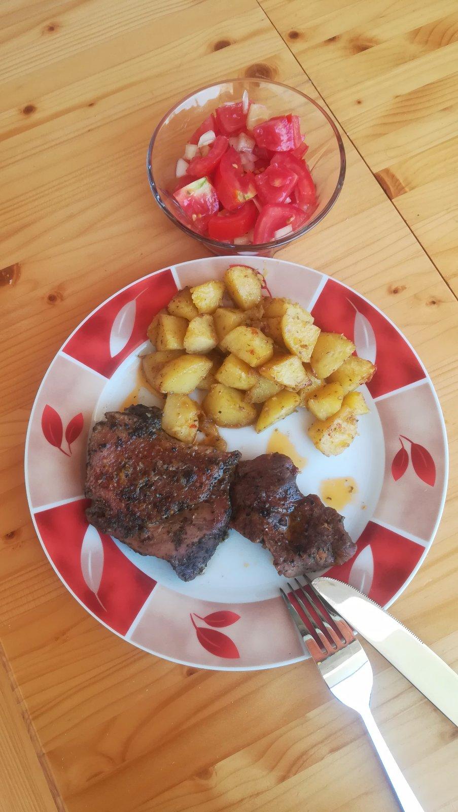 Grilované kačacie prsia (v páci z Lidla) +pečené zemiaky + rajčinovo cibuľový šalát.