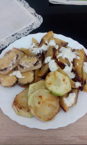 Plnené šampiňóny,opekané zemiaky a vysmazena cuketa s tatarskou omáčkou... 😘