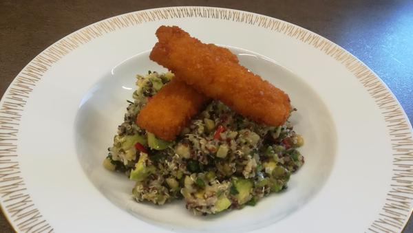 Šalát z quinoi s mungo fazuľkami a avokádom. Nuž, aby to nebolo až také zdravé 😜, tak vyprážané rybie prsty.