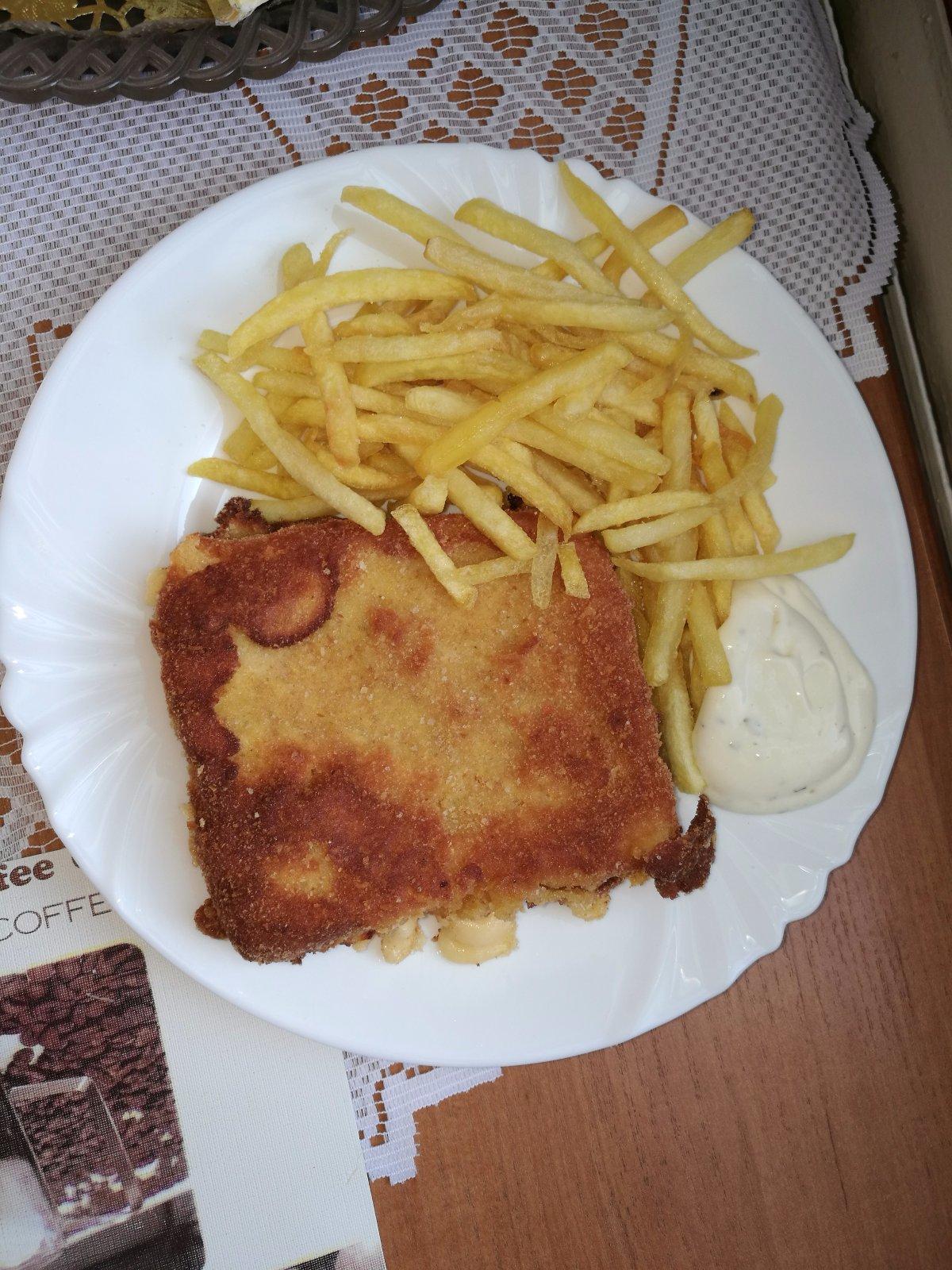 Dnes na obed po velmi dlhom case vyprazany syr s hranolkami+tatarska omacka a visnovy kolac s posypkou 👌😍
