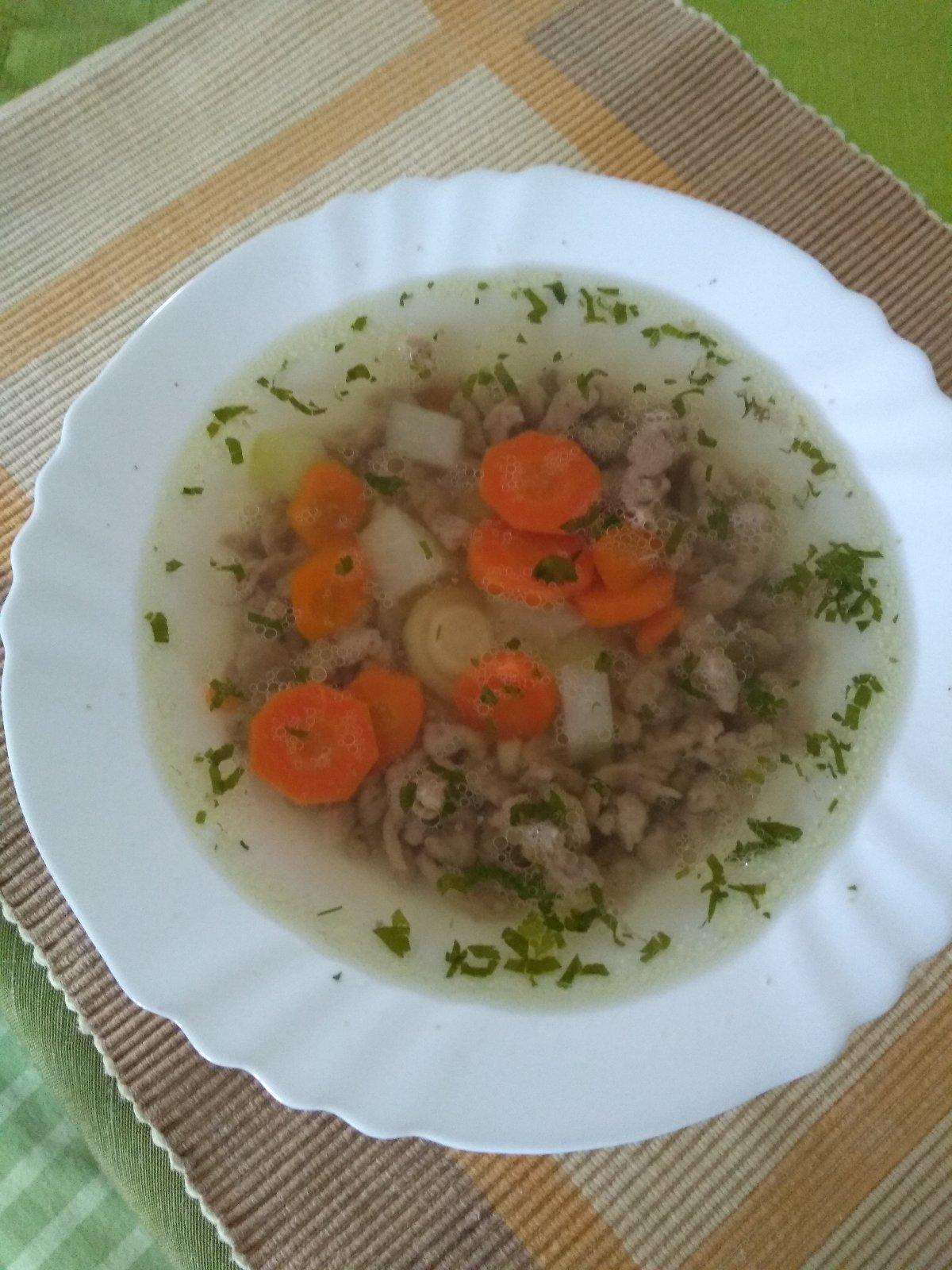 druhé boli falošné bravčové španielske vtáčiky , také to všetko nakrájané v hrnci - dala som varené vajíčko, bravčovú lopatku, kyslé uhorky, párky s vyšším obsahom mäsa / berlínske / mrkvu , k tomu tarhoňa