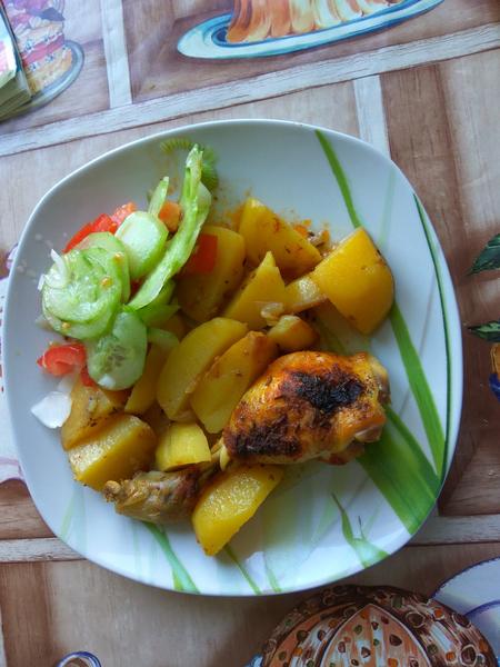 Vyprážané kuracie stehná s opekanými zemiakmi a zeleninovým šalátom. A zo včera dojedáme zeleninovú polievočku 🙂