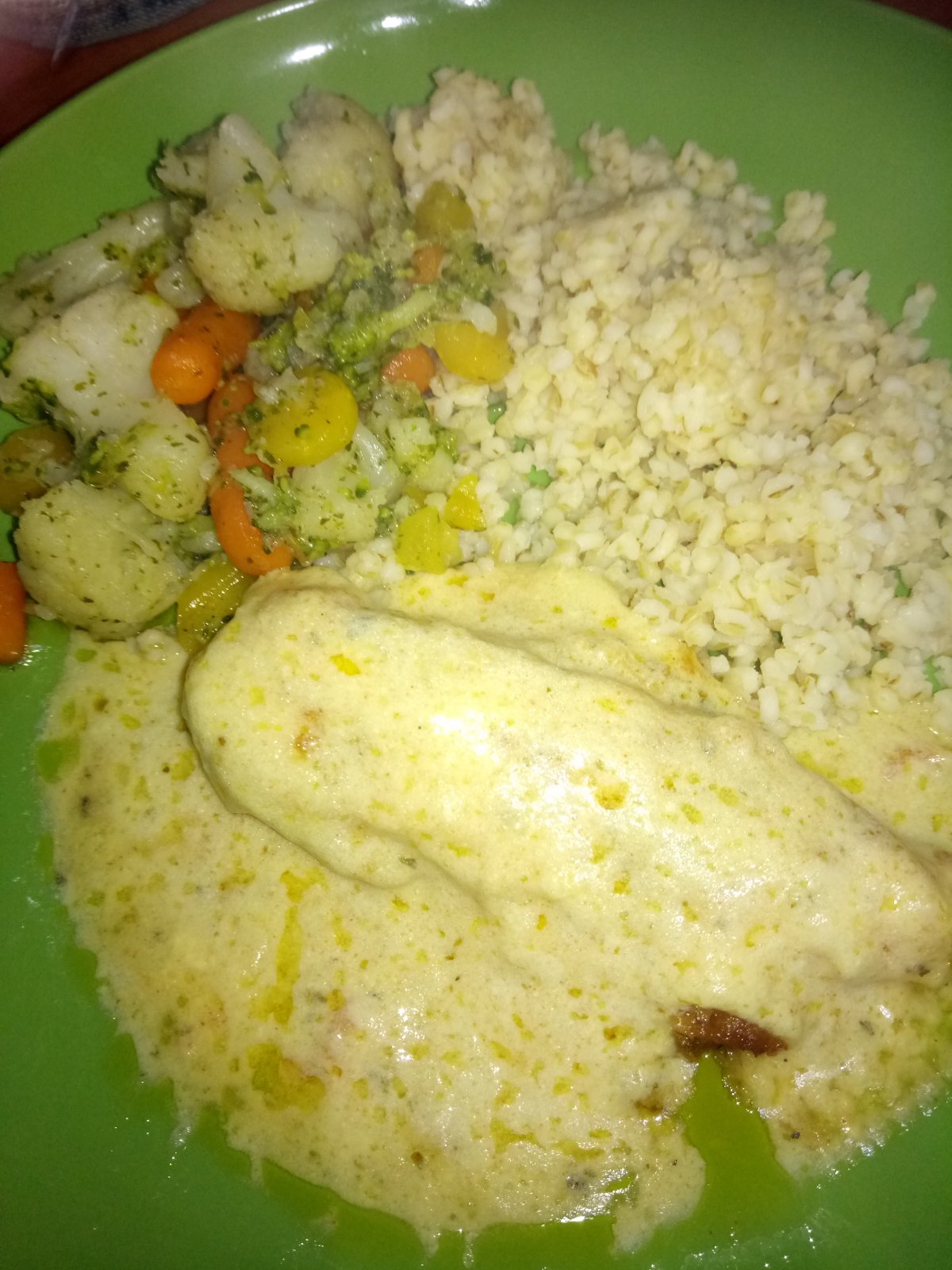 Zeleninová polievka s kuracimi drobkami, kuracie prsia so syrovou omáčkou, dusená zelenina, bulgur.