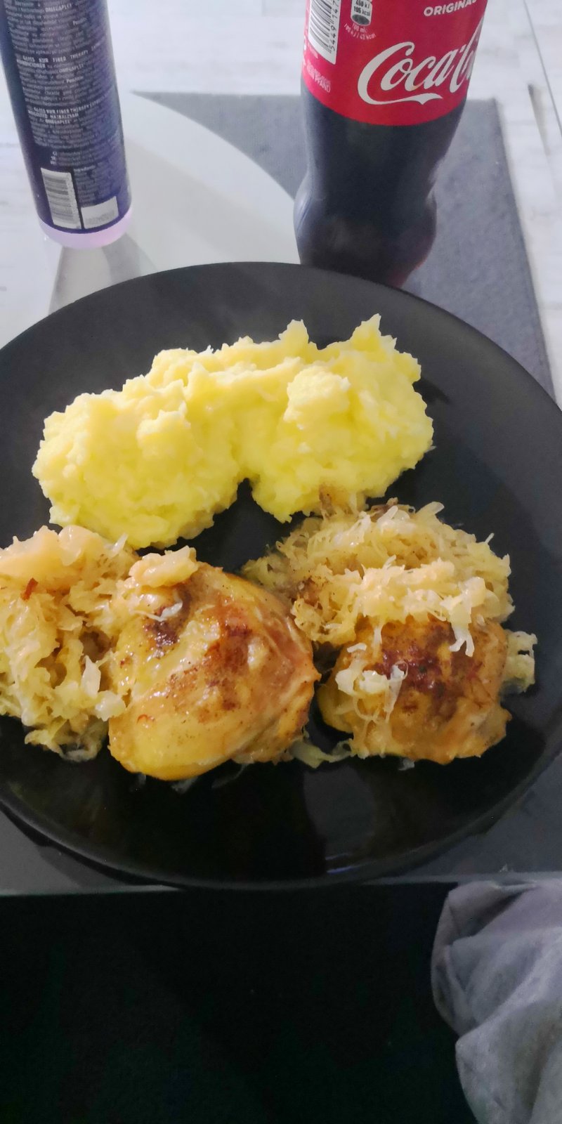 Kuracie stehna na kyslej kapuste, k tomu pyre prvy krat.. Zvykla som to s ryzou jest.... Dnes na veceru chleba vo vajci 🤪🤪🤪