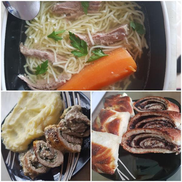 polievka - brokolica, strúhaná mrkva, červená šošovica a bobkový list, bez mäsa, nato zápražka s údenou červenou paprikou - chutí ako polievka s údeným mäsom, druhé nutelové a lekvárové buchty