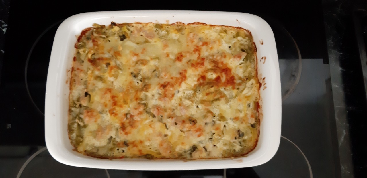 Zapekanu misu( zemiaky morcacie kusky slaninka vajco )