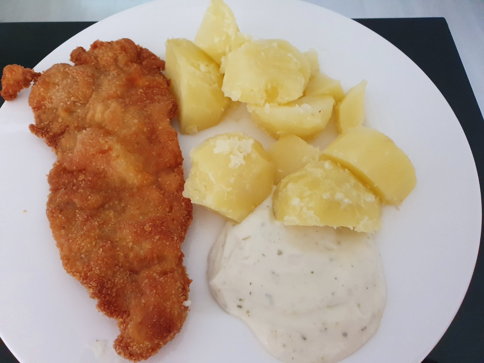 Aj ja som robila vcera plnene vyprazane rezne so zemiakovymi pyre a zeleninovym salatikom, dnes dojedame 🙂