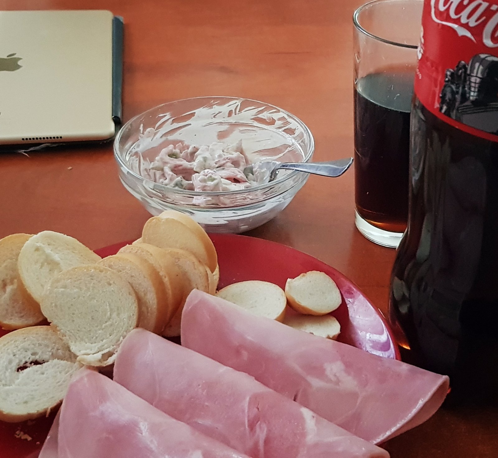 Dnes po zubarovi ranajko-obed "na prasiatko" parizak, sunka, biely rozok a cola...🐷🐷🐷 ...od vcera mame fazulovu s udenym klobaskou zeleninou a fliackami, a americke lievance (velke, hrube 😀) a k tomu domaci marhulovy, jahodovy, dm cokonutelu a ovocie.