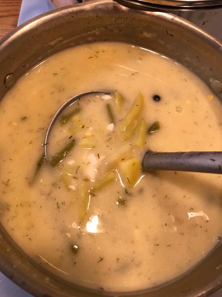 Do vody so zeleninový bujonom, bobkovým listom (3ks) a novým korením, pridám zemiaky a zelenú fazuľku(tento krat od bonduelle mrazenu - vapeur) keď je všetko mäkké pridám kôpor a vajíčka uvarené na tvrdo ktoré pokrájam na drobno. Potom si pripravím kyslú smotanu do ktorej pridám trochu mlieka, červenú sladkú papriku mletu, hladkú muku - rozmiešať a za stáleho miešania pridať do polievky. Nechať prevriet a potom dochutit vegetou, alebo soľou, kto ma ako rad 🙂 a ak je malo kyslá pridám aj trochu octu alebo citrónovej stavy 🙂
