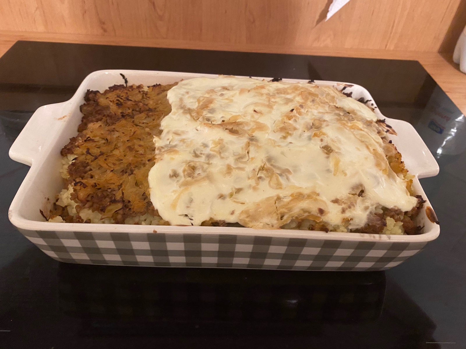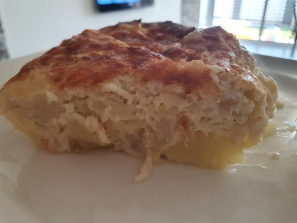 zap3cene zemiaky a kur.prsiami slaninou vajcom
