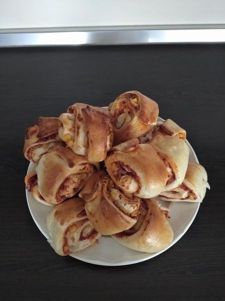 Tých pizzovnikov vyjde cca 18 ks. Cesto delíme na polovicu, potom rozvaľkáme do obdĺžnika. Zrolovane cesto sa kraja do trojuholníka, ale nie do špičky, na šírku cca 1 cm, inak by to nedrzalo tvar. Super je z toho kakaovnik.