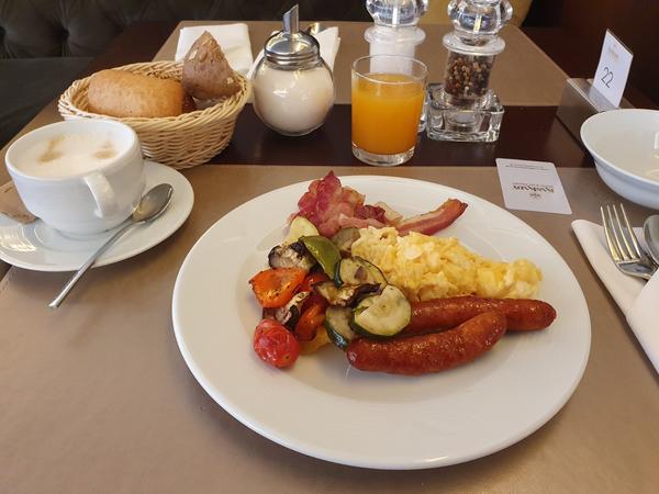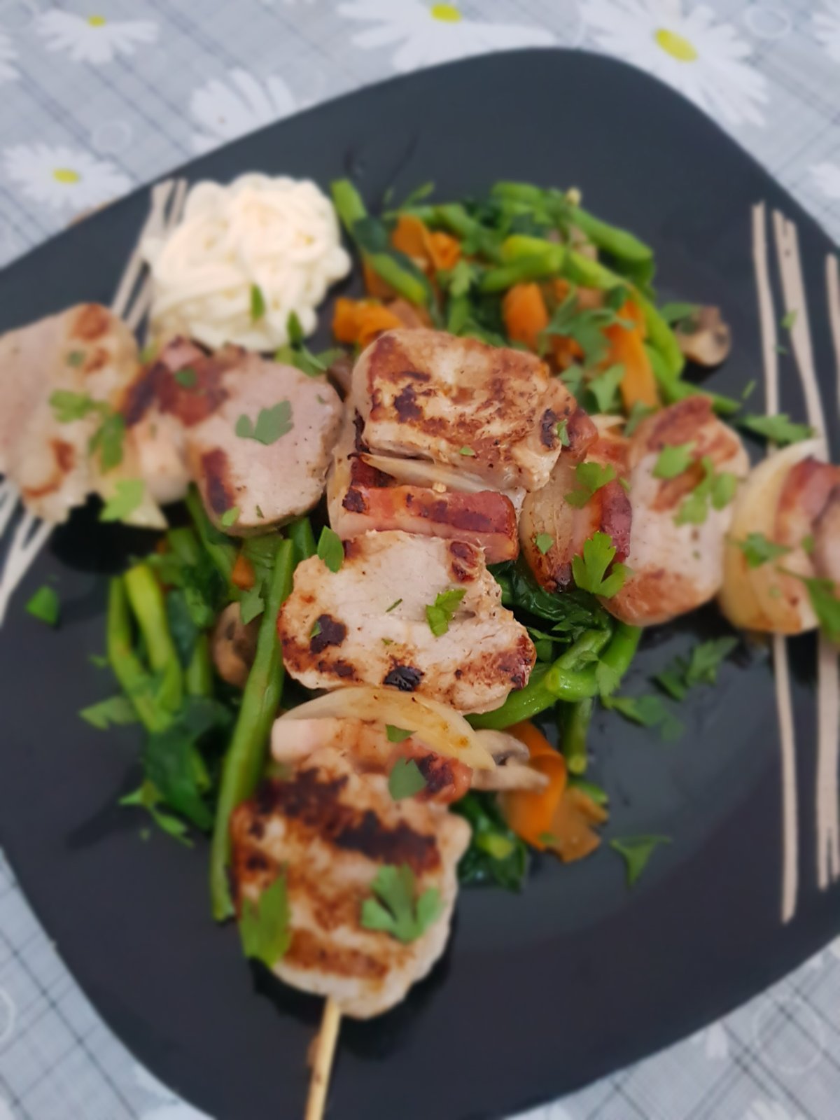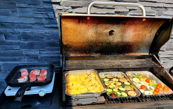 Losos, opekané zemiaky pre dieťa, ja grilovaný hermelín a miešaný šalát. Večer obložené chlebíčky.