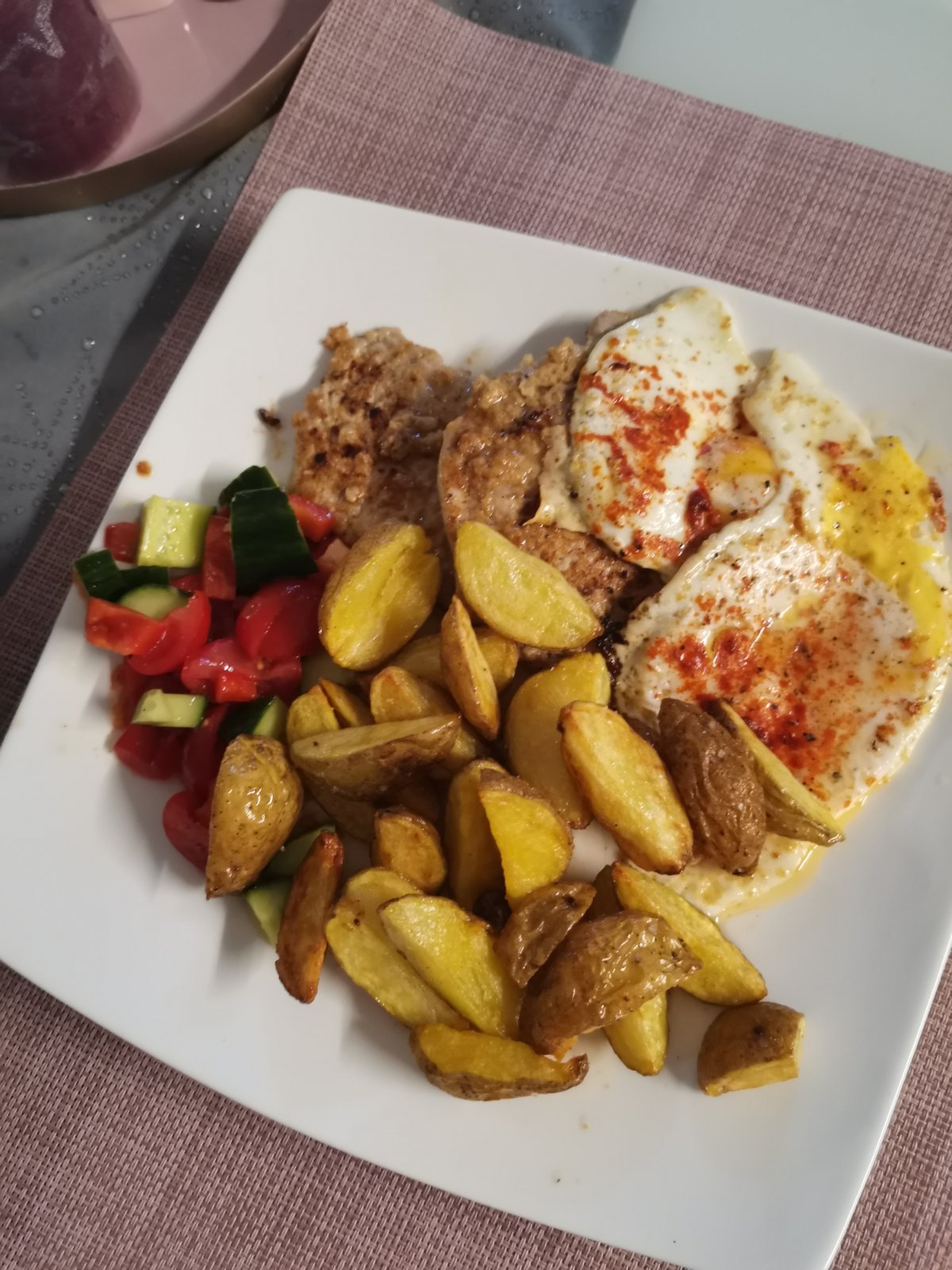 My máme zo včera zemiakovú polievku s vajíčkom na kyslo, dneska restovana kúr.pecienka s ryžou, a makové šúľance.