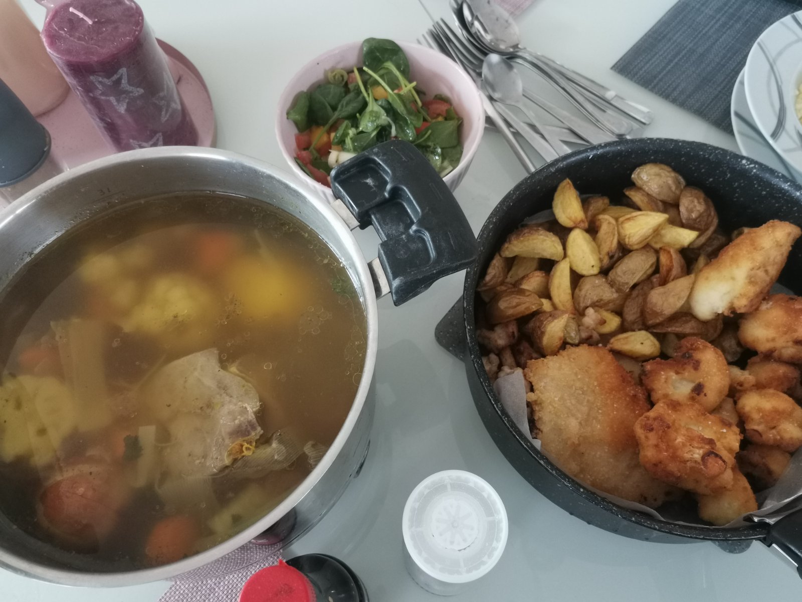 Hustá zeleninová polievka, losos, opekané zemiaky. Zajtra budu dukatove buchtičky, skúsim kváskové.