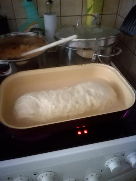 @tinkerbell na dve knedle dám 500 g polohrubej múky , kvások , malú lyžičku soli . Zamiešam , dám kysnúť . Rozdelím na dva časti ,vytvarujem knedľu . Chvíľku nechám na doske ešte kysnúť . Do pol pekáča dám vodu , keď zovrie dám do nej knedľu , nechám 20 minút variť ,vyberiem , popichám vydličkou alebo špáradlom ,potriem olejom . Druhú knedľu dám zas variť ,ak by bolo málo vody ,tak doliať a počkať kým bude vrieť , radšej viac vody , lebo som mala málo ,tak mi knedľa zo spodu prihorela . Posielam foto v akom pekáči to robím. Plus zakryjem počas varenia druhým na slabom plameni .