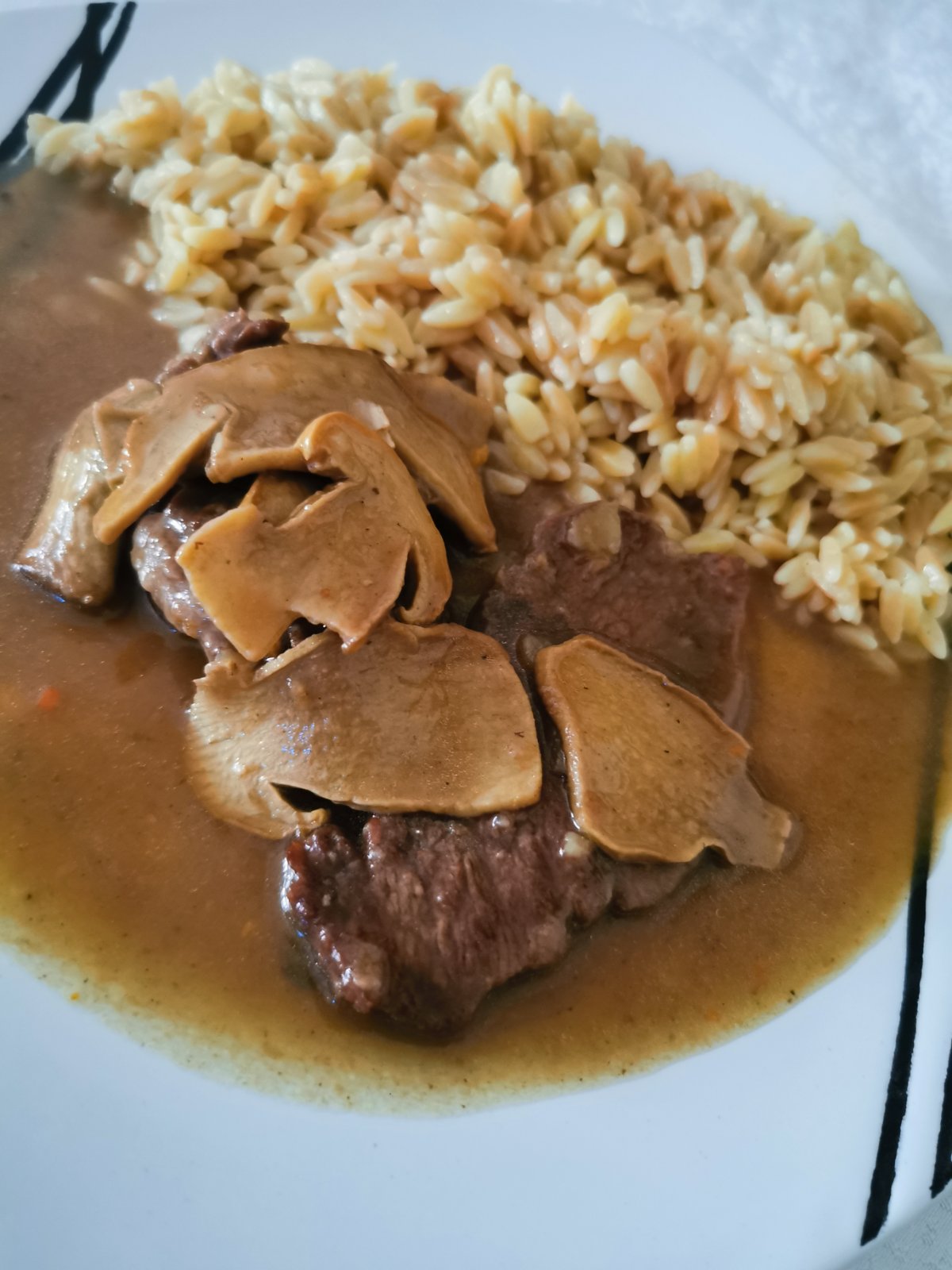 Hovädzie na hubách so slovenskou ryžou a tvarohový koláčik s ovocím
