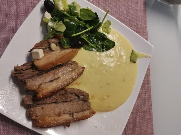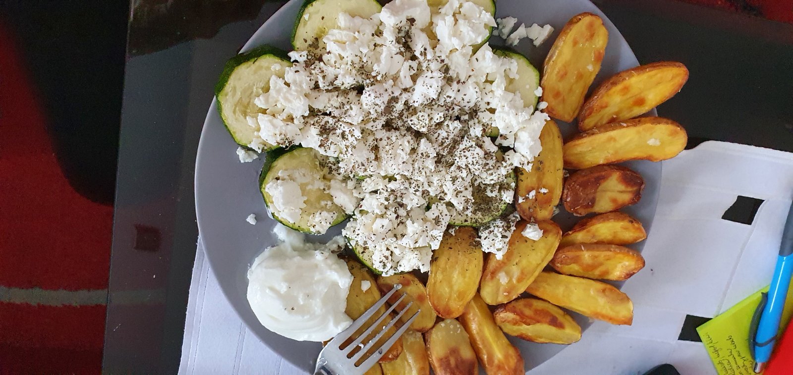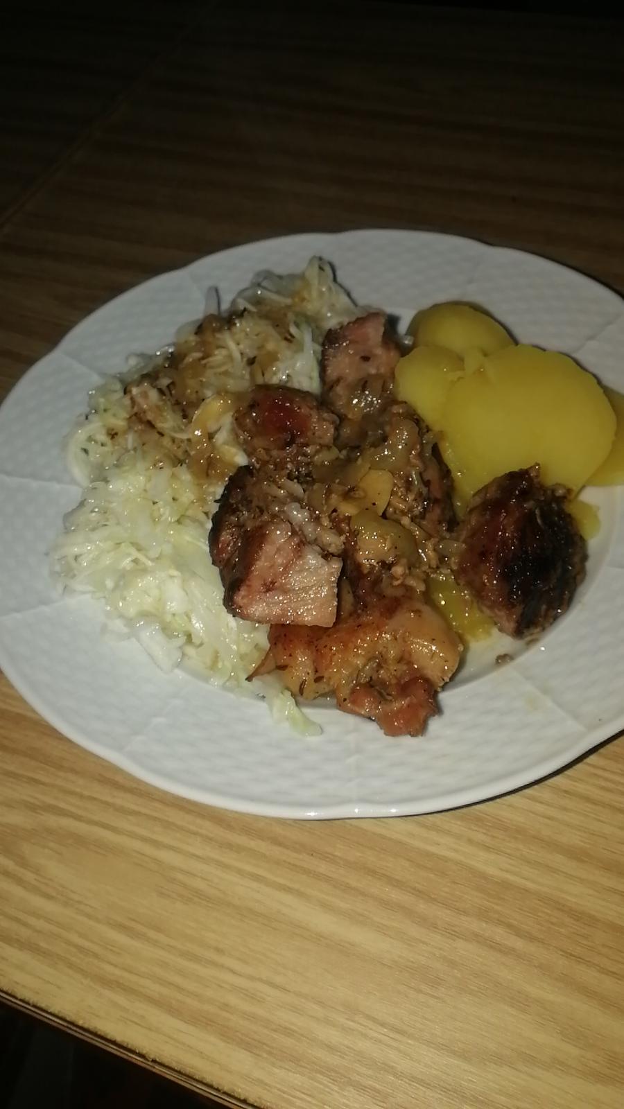 Treska na prirodno(sol,c.korenie,rasca,susena cibula,susena petrzlen.vnat,mleta paprika), pecene bataty(sol,suseny cesnak), zeleninovy salat(salat,rukola,mrkva,uhorka,paprika,cibula,cerv.kapusta - oliv.olej a citron, sol, korenie)